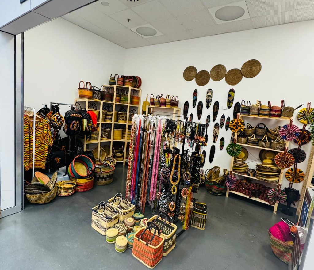 Handcrafted masks, baskets, and woodwork.